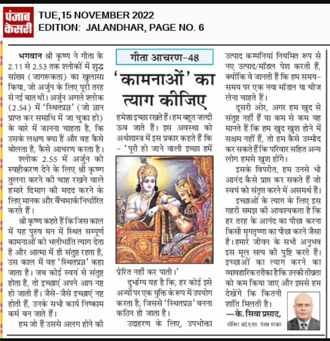श्रीकृष्ण कहते हैं कि जिस काल में यह पुरुष मन में स्थित सम्पूर्ण कामनाओं को भलीभांति त्याग देता है और आत्मा में ही संतुष्ट रहता है, उस काल में वह ‘स्थितप्रज्ञ’ कहा जाता है। जब कोई स्वयं से संतुष्ट होता है, तो इच्छाएं अपने आप नष्ट हो जाती हैं। जैसे-जैसे इच्छाएँ नष्ट होती हैं, उनके सभी कार्य निष्काम कर्म बन जाते हैं।