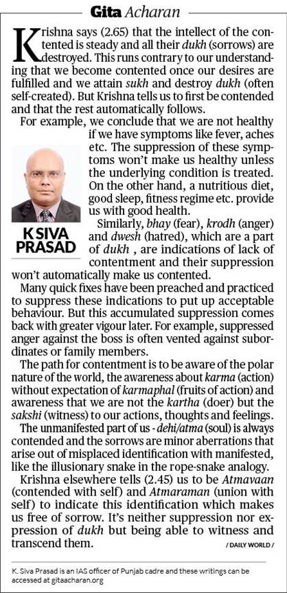 Krishna says (2.65) that the intellect of the contented is steady and all their dukh (sorrows) are destroyed. This runs contrary to our understanding that we become contented once our desires are fulfilled and we attain sukh and destroy dukh (often self-created). But Krishna tells us to first be contended and that the rest automatically follows.