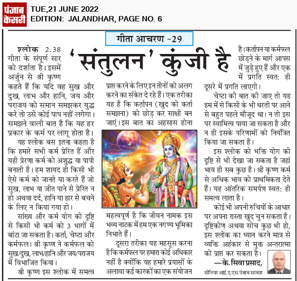 श्लोक 2.38 गीता के संपूर्ण सार को दर्शाता है। इसमें अर्जुन से श्रीकृष्ण कहते हैं कि यदि वह सुख और दुख, लाभ और हानि, और जय और पराजय समान समझकर युद्ध करे तो उसे कोई पाप नहीं लगेगा। समझने वाली बात है कि यह हर प्रकार के कर्म पर लागू होता है।