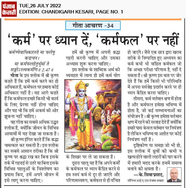 इस श्लोक के शाब्दिक अर्थ को व्यवहार में लाना ही हमें कर्मयोग के शिखर पर ले जा सकता है।